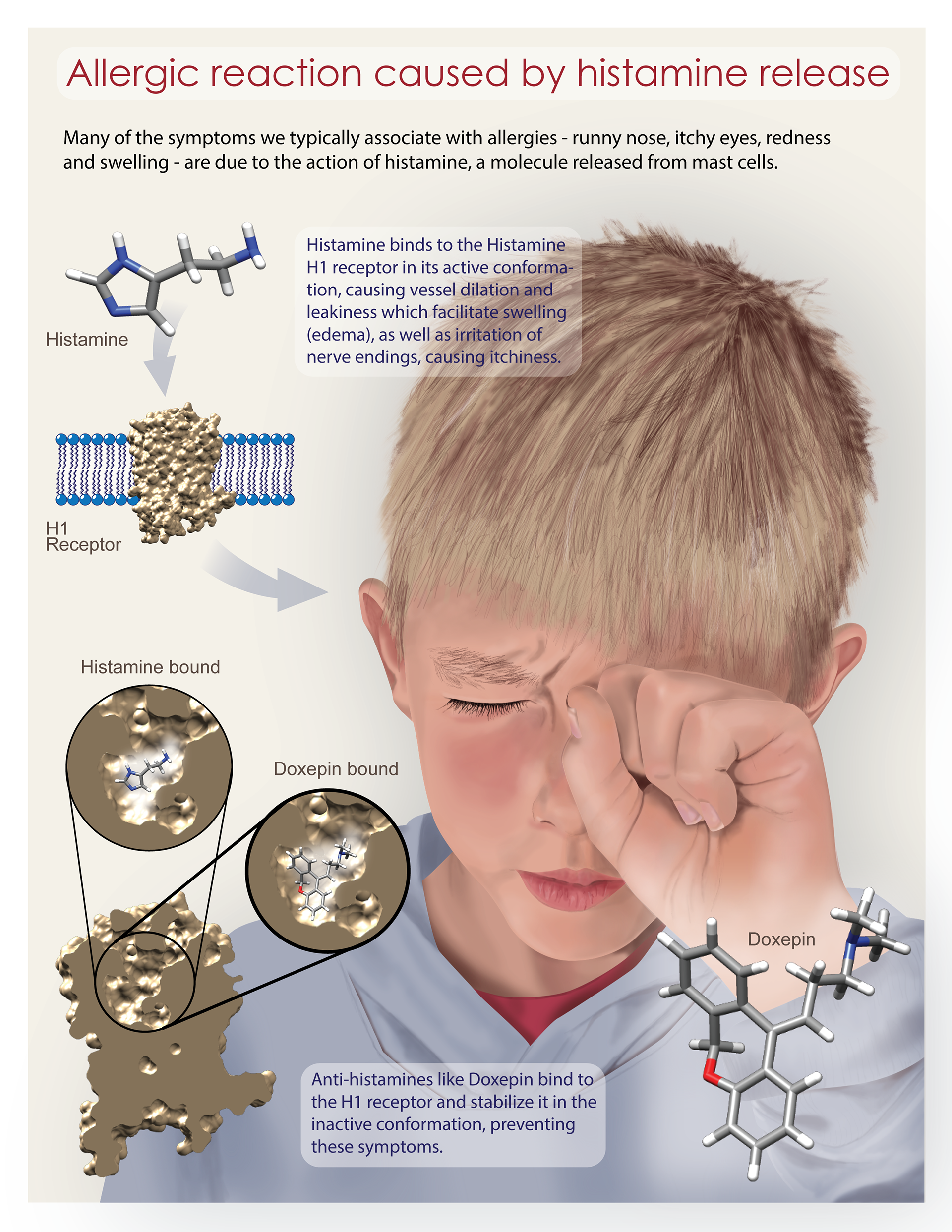 Poster-style didactic illustration showing physiology and molecular mechanism of allergic reaction. Created using Photoshop & Illustrator.