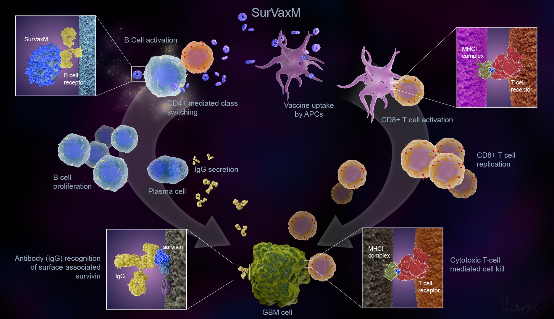 Still image created for the Mimivax website, showing SurVaxM's mechanism of action (MOA). Created using Cinema 4D and Adobe Photoshop.